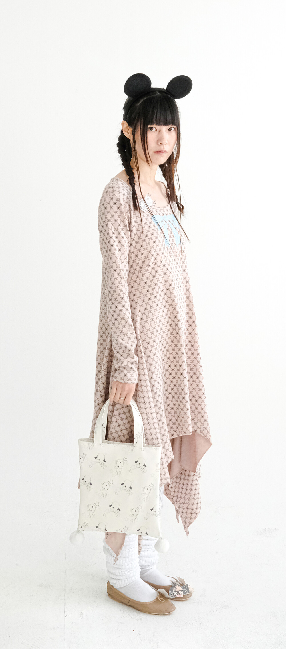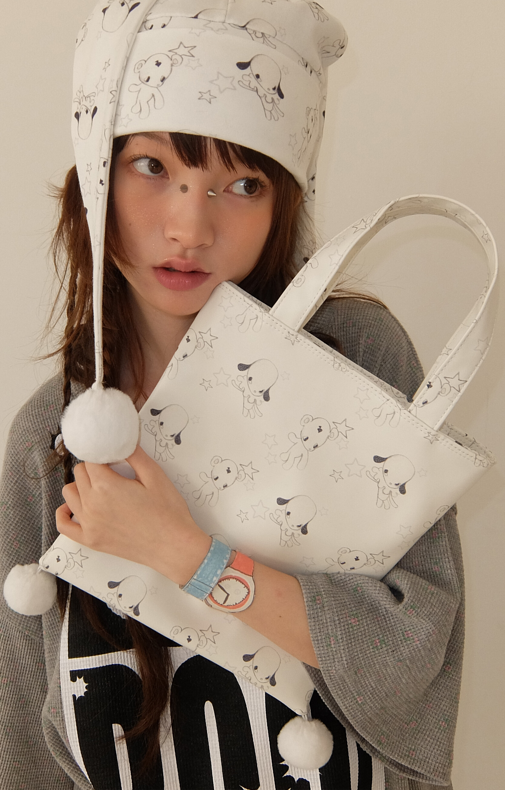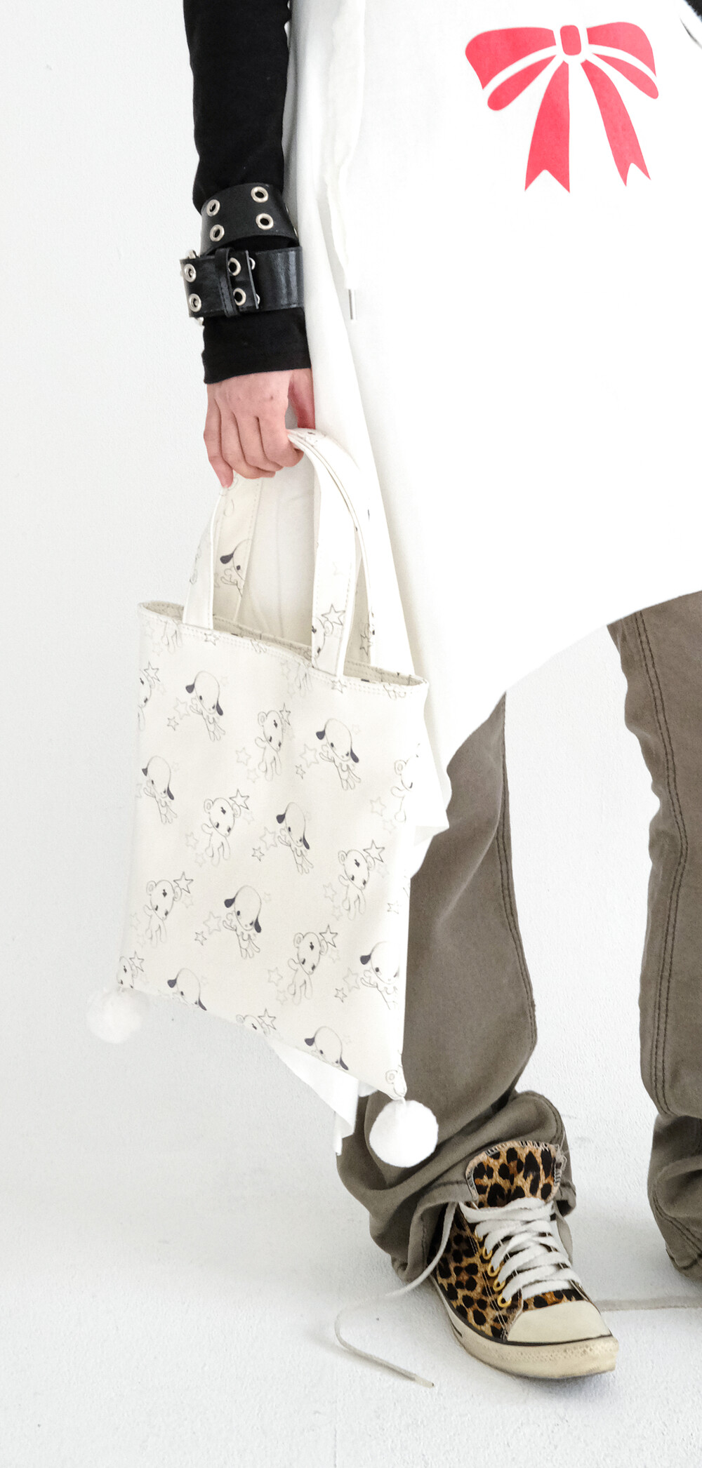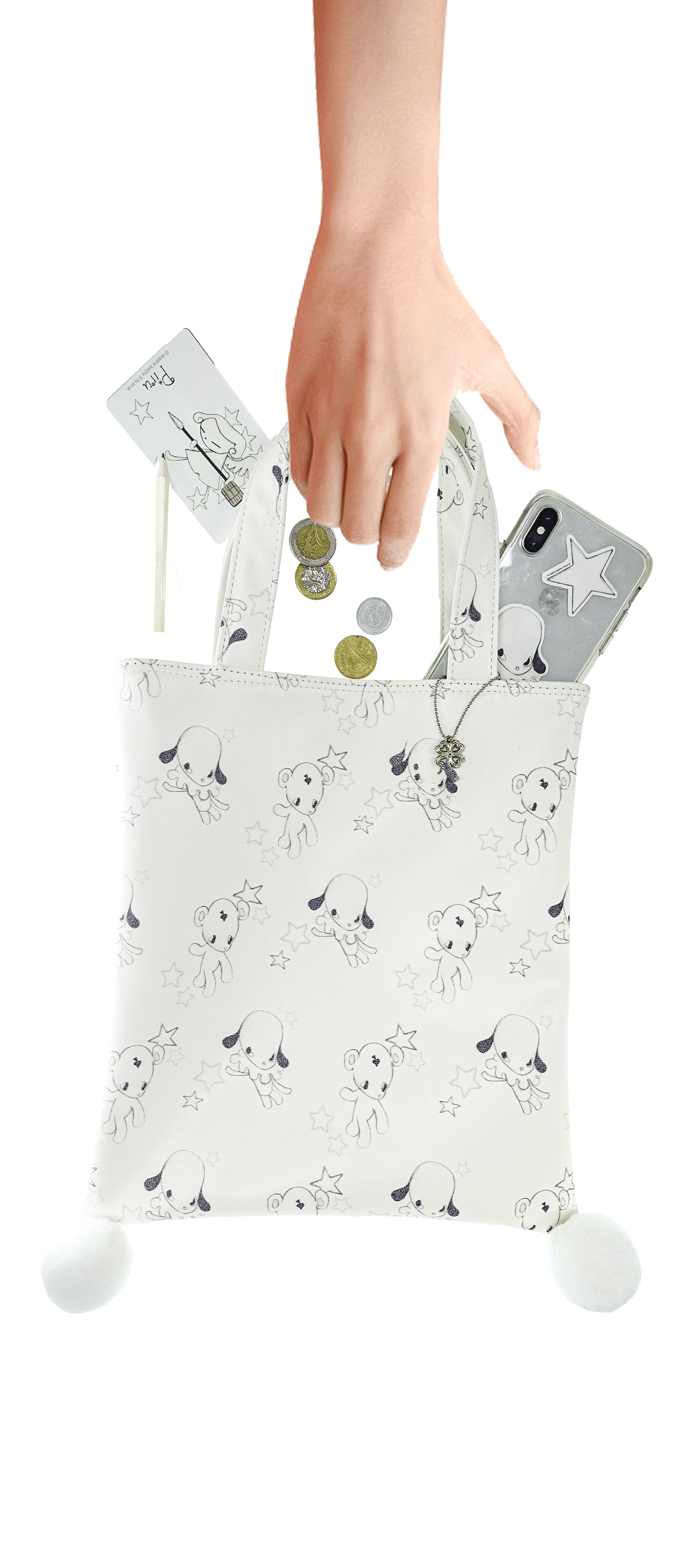 - 러블리한 무드의 Jun&Ello 패턴과 폼폼 디테일이 매력적인 레더 토트백