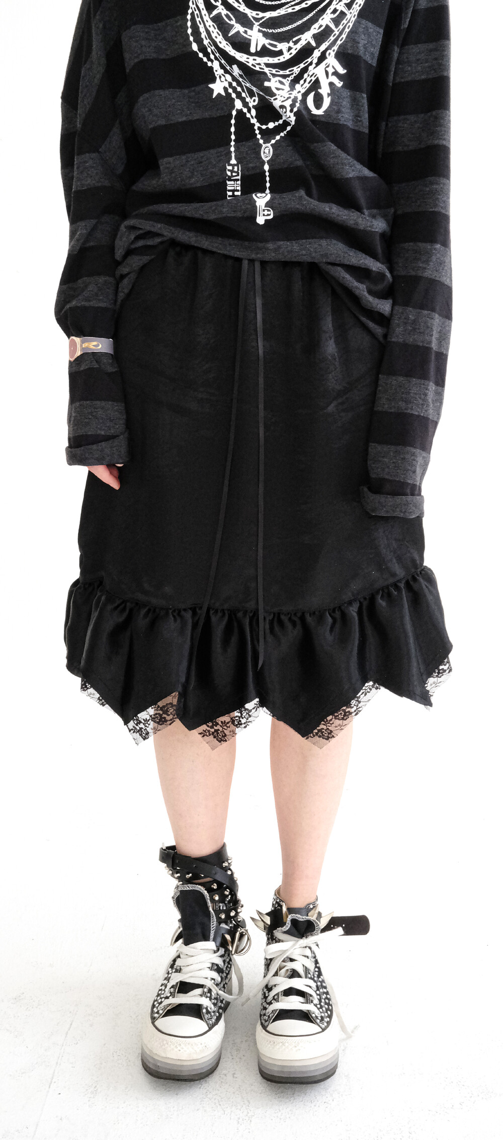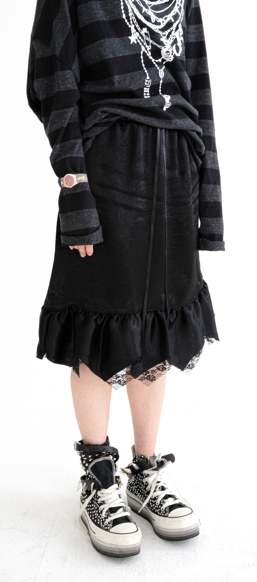 - 실키한 새틴 소재와 컷팅 디테일이 매력적인 미디 스커트
